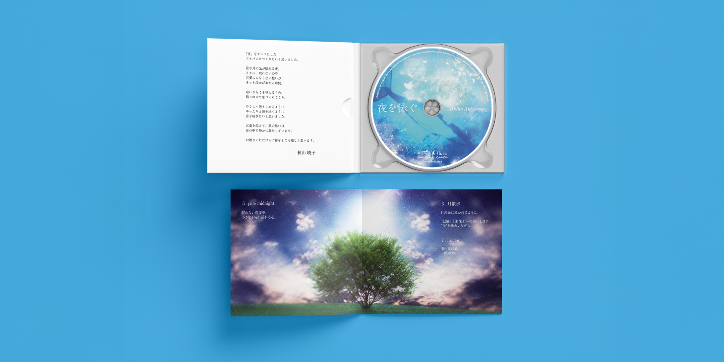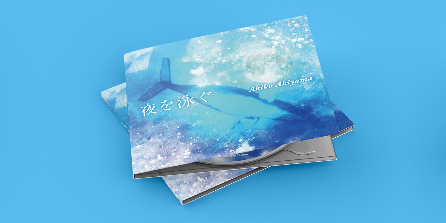ピアニスト・作曲家の秋山暁子さんのアルバム『夜を泳ぐ』のCDジャケット・ブックレット・盤面デザインを担当しました。幻想的な満月の夜をゆったりと泳ぐクジラを、絵画のようなタッチでビジュアライズ。夜の静けさや、心の奥にひそむ想いなど、一見ネガティブとされがちなエネルギーを遠ざけるのではなくむしろそっと寄り添う優しい楽曲たち。CDに付属するブックレットにおいても、暁子さんの紡ぐ音楽のもつ豊かで奥深い世界観をビジュアルを通して表現することを目指しました。
